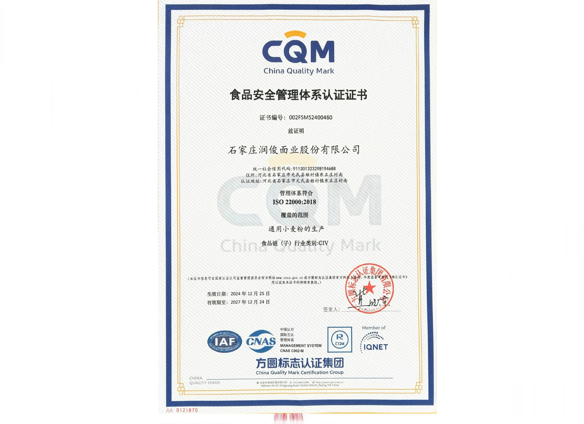 食品安全管理体系认证证书